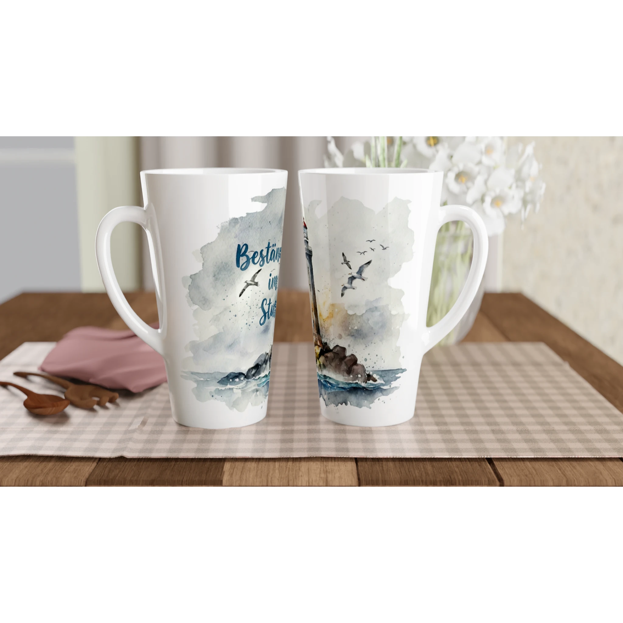 Die Beständig im Sturm Latte Tasse 440 ml zeigt einen Leuchtturm auf rauen Felsen, umgeben von bewegtem Wasser, weitem Himmel und kreisenden Möwen. Darüber steht der Schriftzug Beständig im Sturm – nicht als dekorativer Zusatz, sondern als eigentliche Haltung des Motivs. Die Illustration verbindet maritime Weite mit stiller Kraft und wirkt dadurch nicht laut dramatisch, sondern gesammelt, standfest und klar. So entsteht ein Bild, das mehr ist als bloße Küstendekoration: ein ruhiger Begleiter mit Charakter.