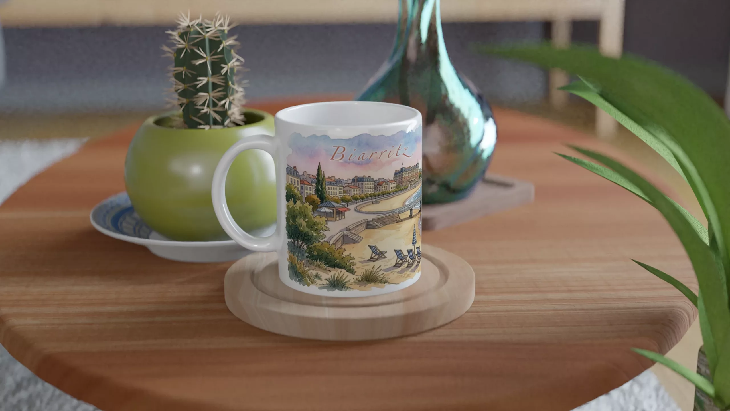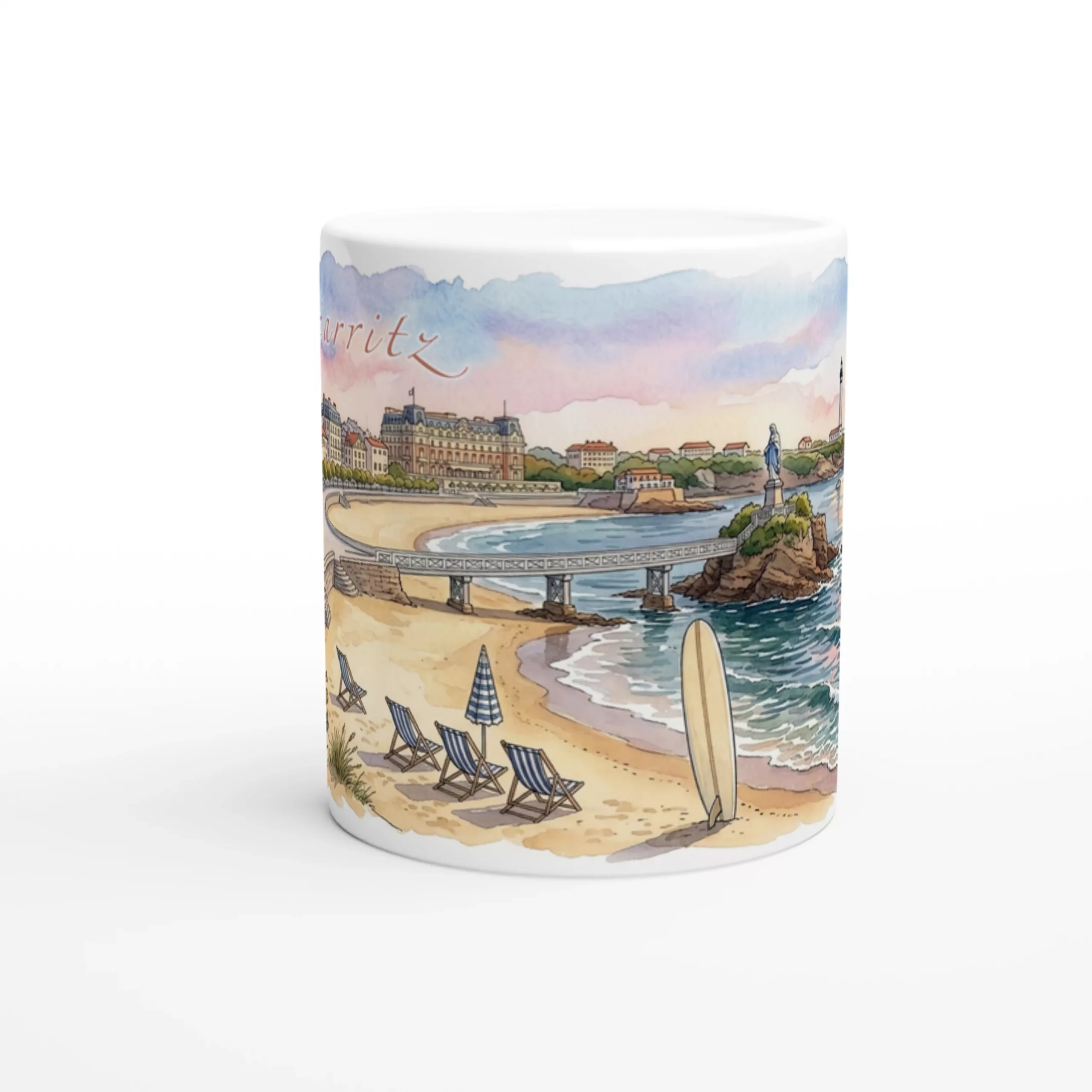 Auf der klassischen 330-ml-Tasse entfaltet sich das Biarritz-Motiv als ruhige Rundumszene besonders schön. Strand, Wasserlinie, Felseninsel und Küstenarchitektur sorgen dafür, dass das Bild auch beim Drehen interessant bleibt und nicht wie ein einzelner Ausschnitt wirkt. So entsteht ein zusammenhängender Eindruck, der auf der weißen Keramik leicht, luftig und hochwertig erscheint.