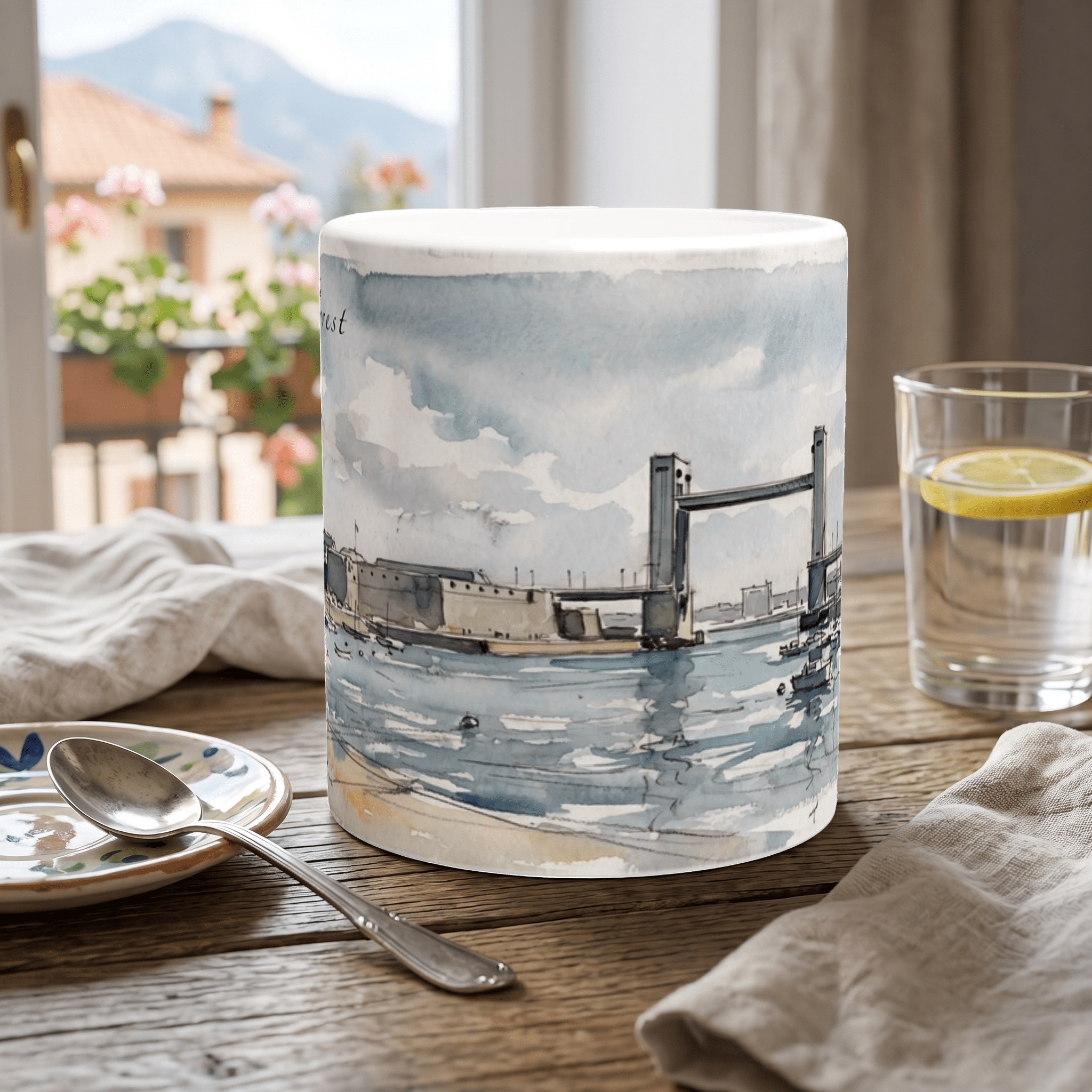 Die Brest Tasse 330 ml zeigt die Stadt in einer ruhigen, lichtoffenen Hafenszene: mit weiter Wasserfläche, kleinen Booten, der markanten Brückenkonstruktion und der bretonischen Uferkante unter weitem Himmel. Das Motiv verbindet feine Skizzenlinien mit sanften Aquarellflächen in kühlen Blau-, Grau- und Sandtönen. So entsteht kein lautes Küstenbild, sondern ein stilles maritimes Stadtmotiv mit Raum, Luft und jener sachlichen Ruhe, die Brest so eigen sein kann.