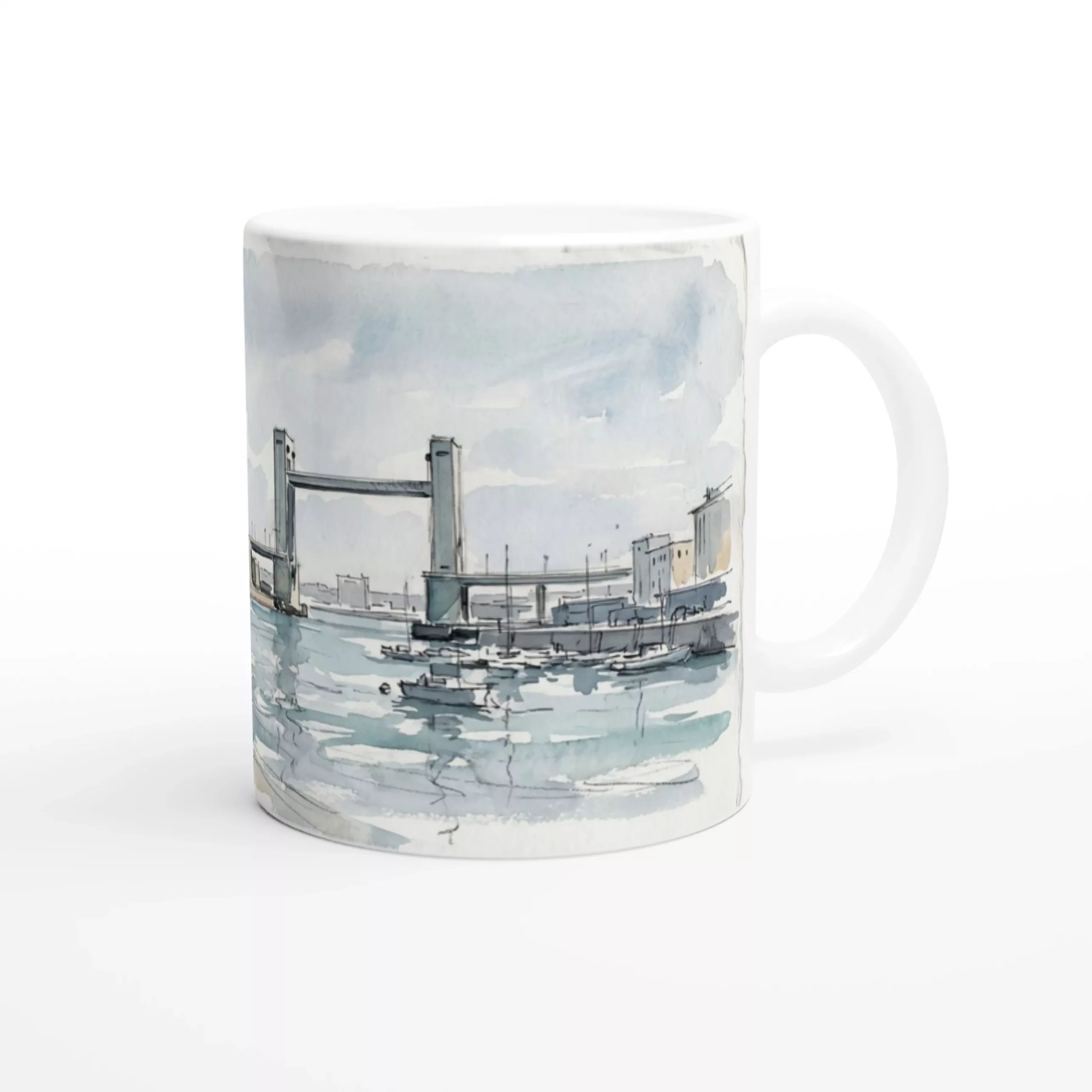 Auf der klassischen 330-ml-Tasse entfaltet sich das Motiv besonders harmonisch. Die horizontale Wasserlinie, die offenen Himmelsflächen und die Brücke schaffen eine ruhige Bildbewegung, die sich beim Drehen der Tasse sehr schön lesen lässt. So entsteht kein enger Ausschnitt, sondern ein zusammenhängender Hafenblick mit Raum und Luft.
