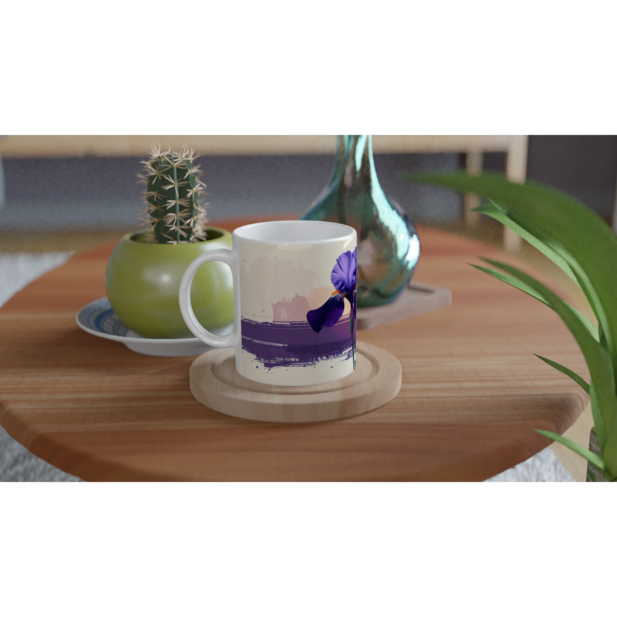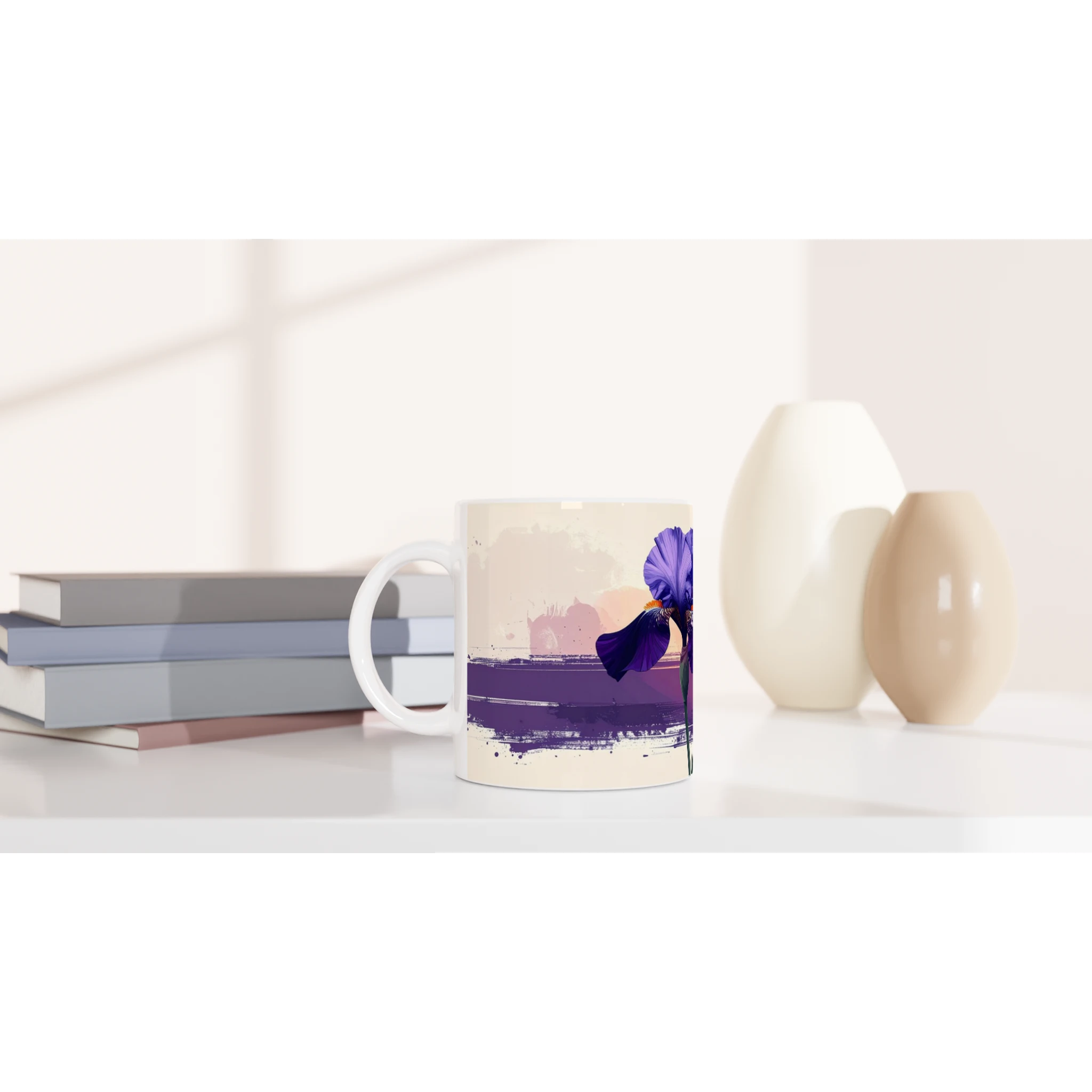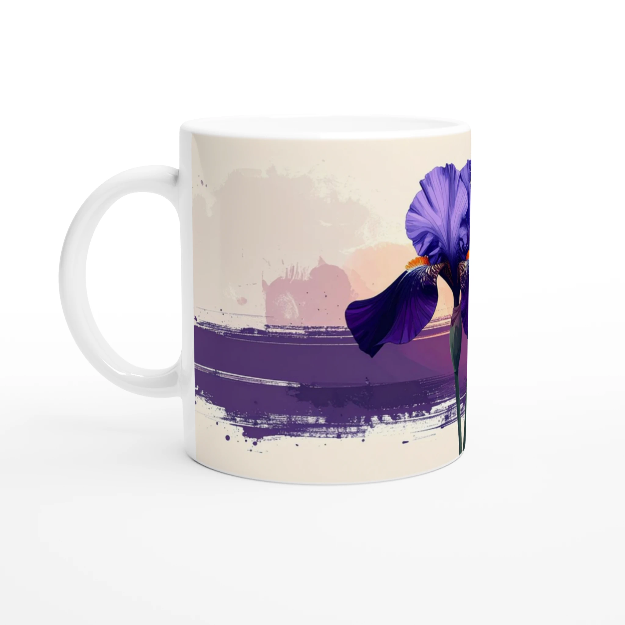 • Iris Aquarell Tasse mit tiefvioletter Schwertlilie und modernem Grafik-Element auf weißer Keramik
