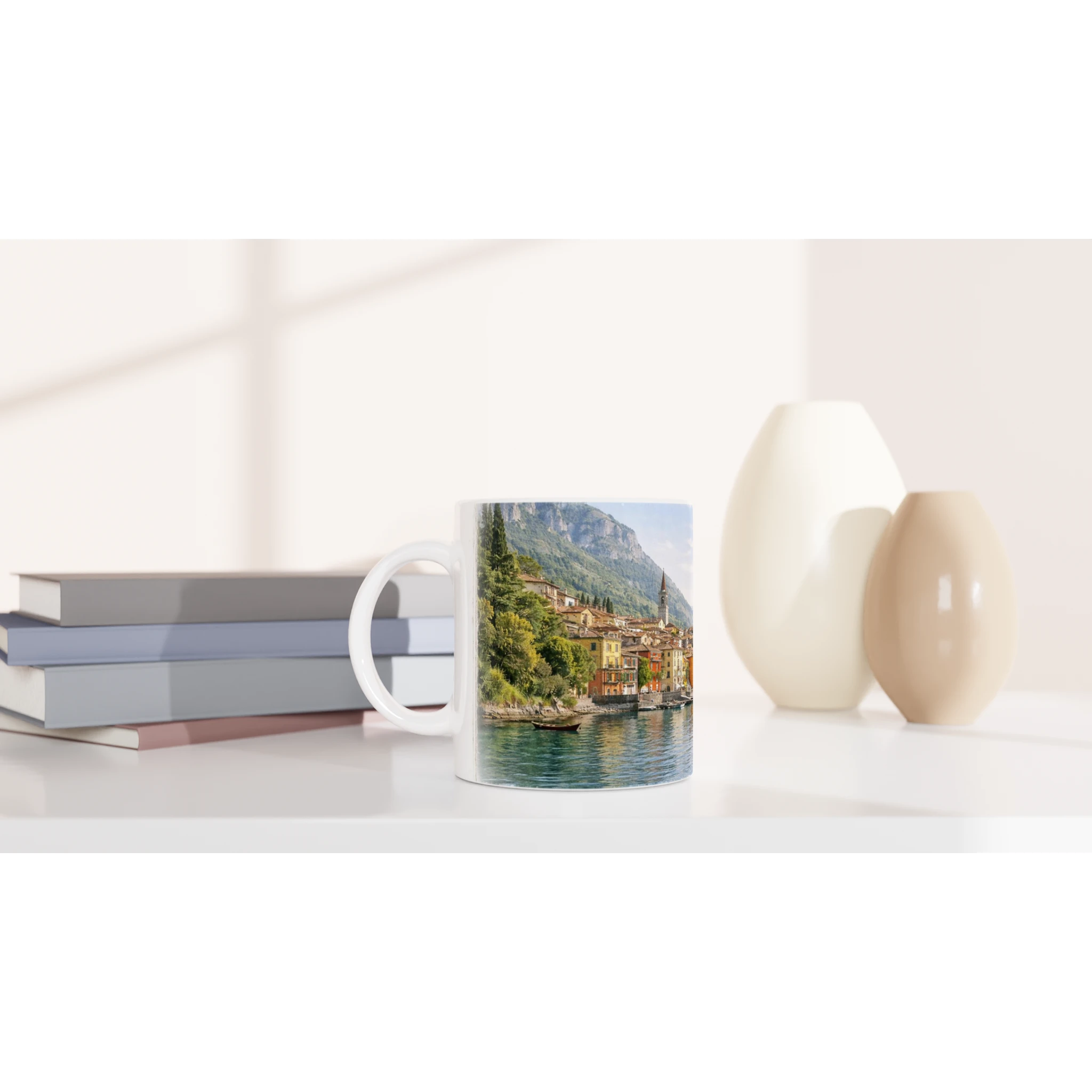 Die Lago di Como Tasse 330 ml bringt die stille Schönheit des Comer Sees auf eine klassisch weiße Keramiktasse.