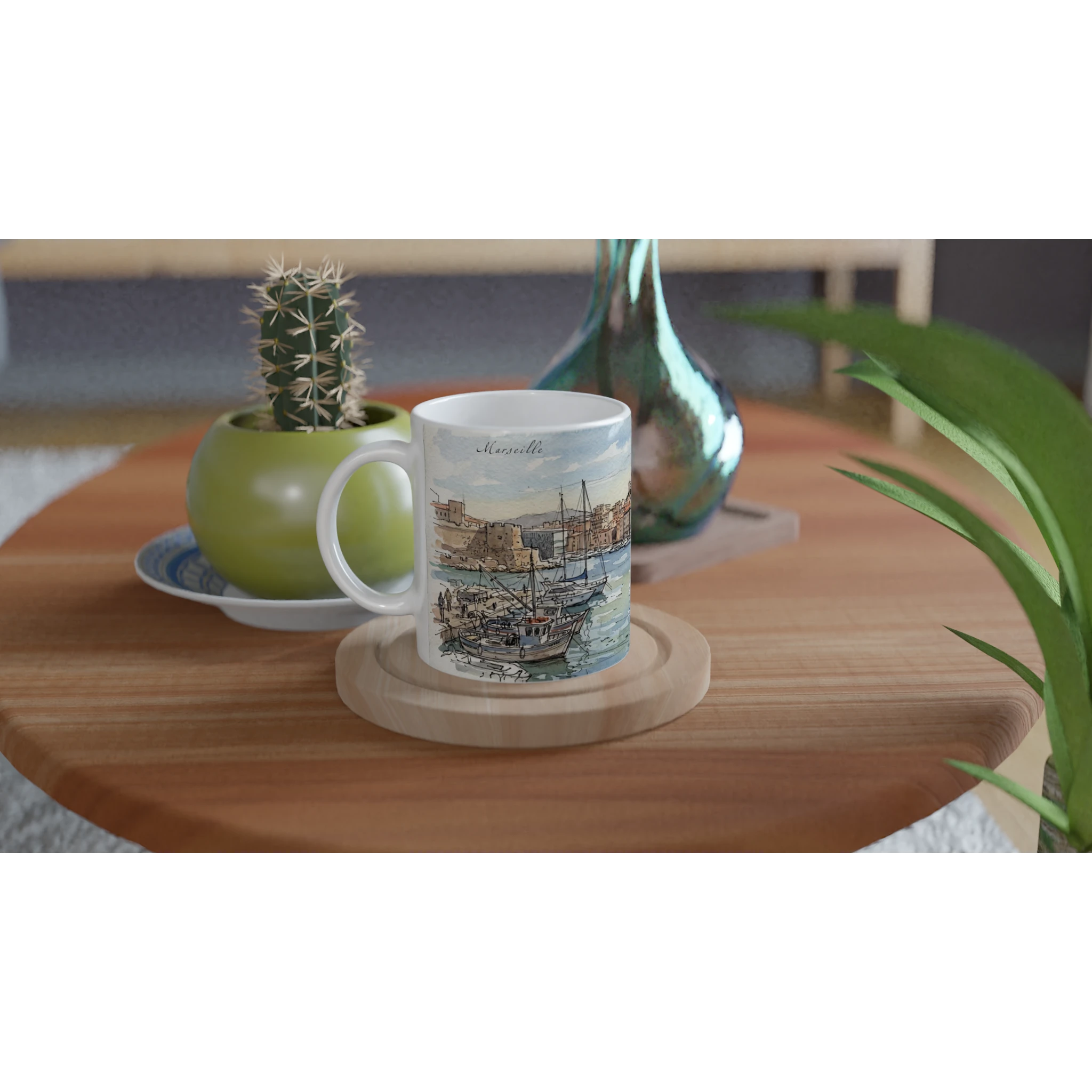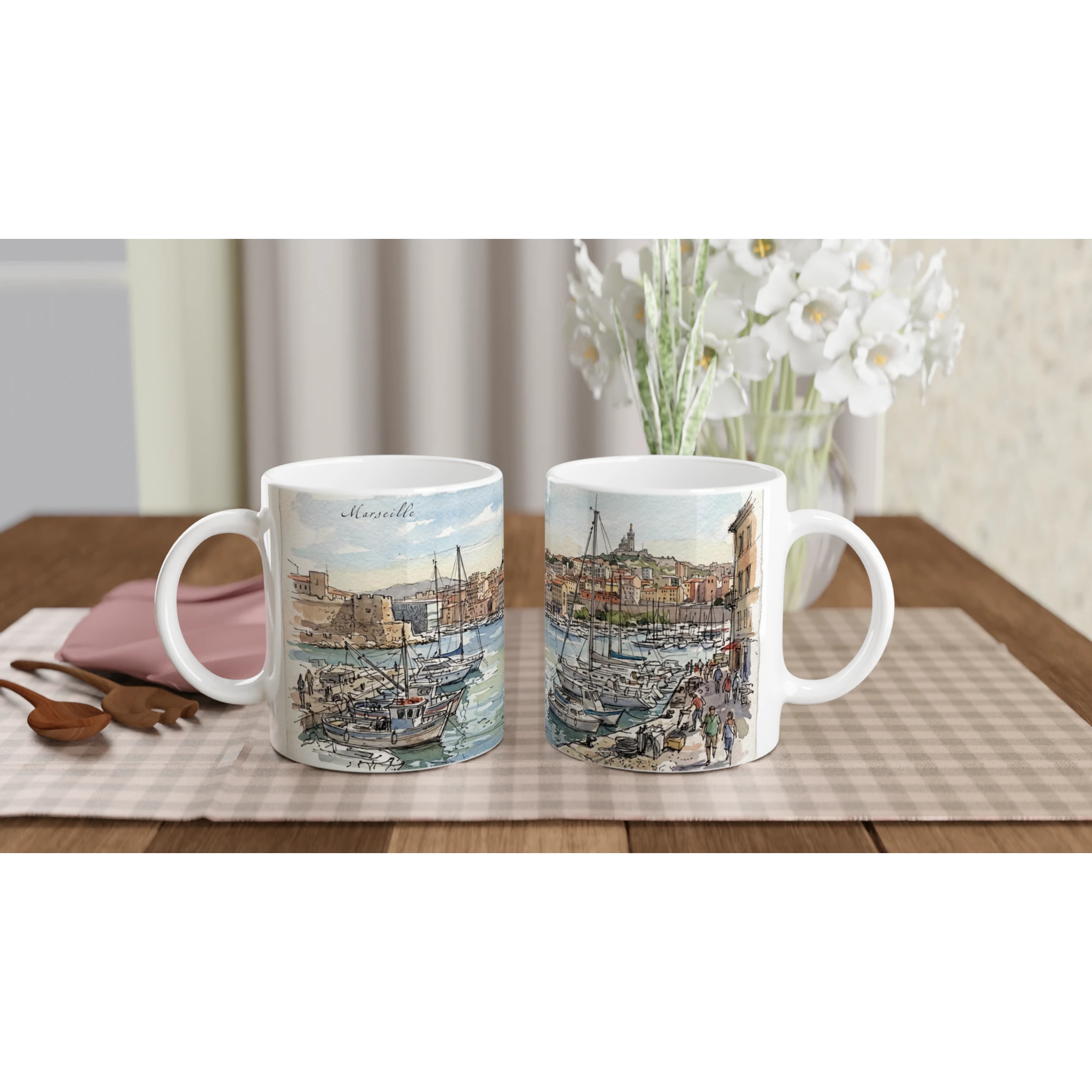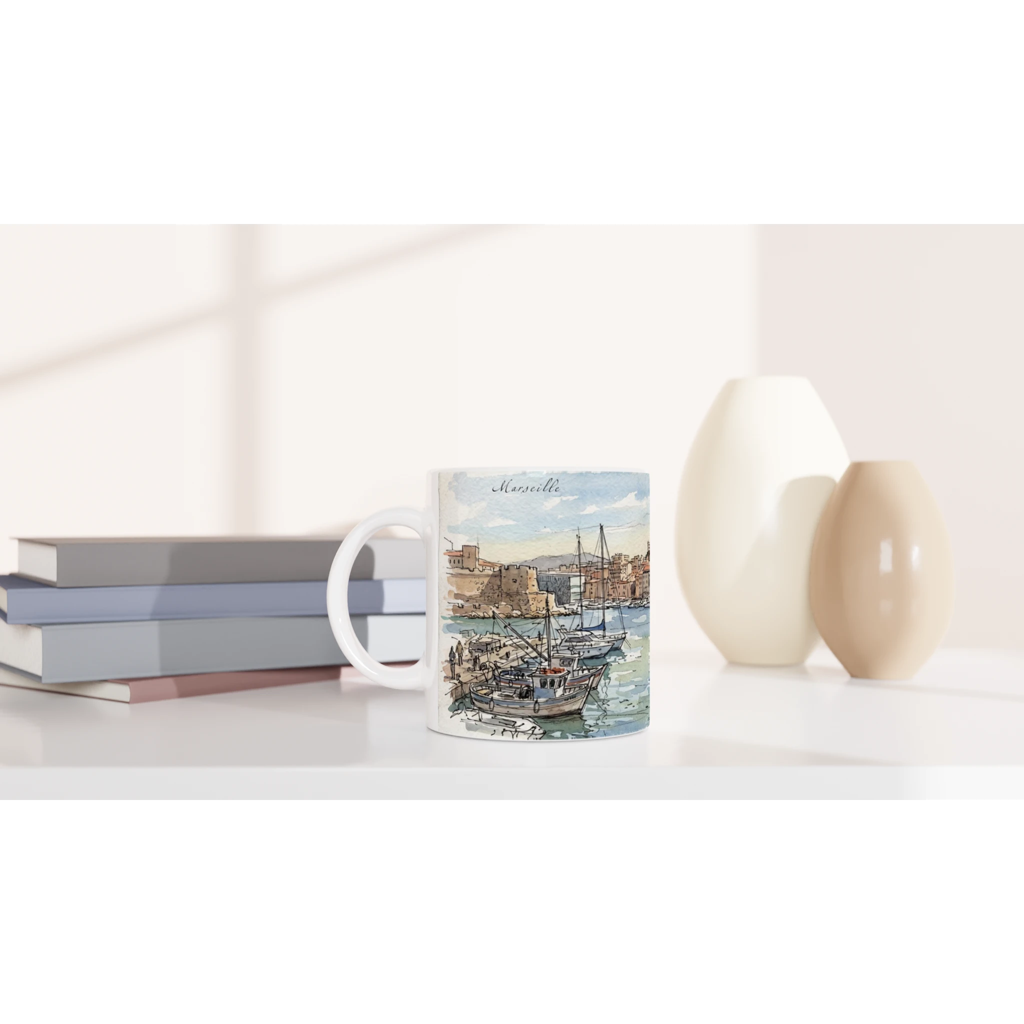 Marseille Tasse 330 ml mit Hafen, Booten, Altstadt und mediterranem Stadtpanorama im feinen Aquarellstil.