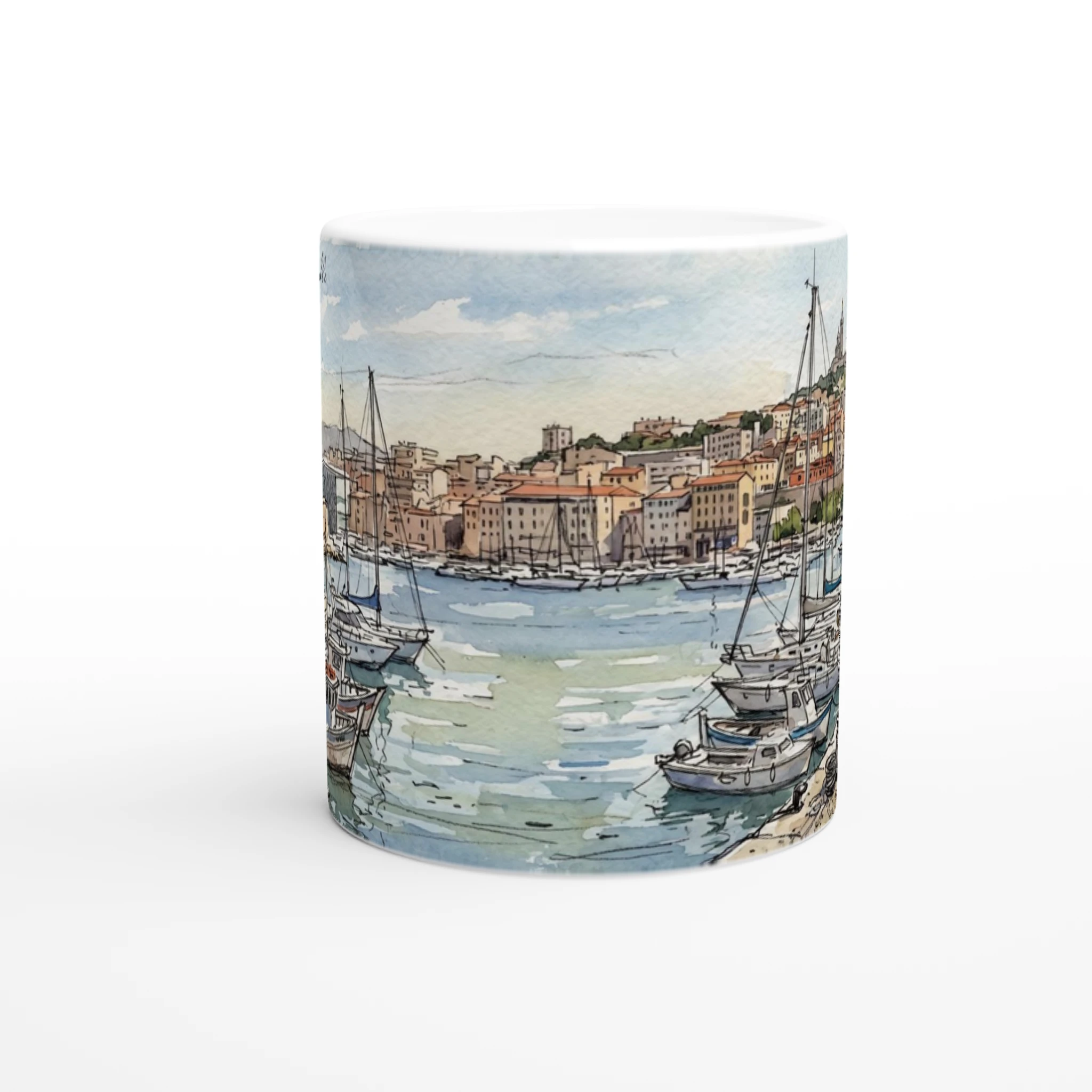 Marseille Tasse 330 ml – Hafenblick, Boote und mediterrane Stadtruhe in feiner Aquarelloptik
