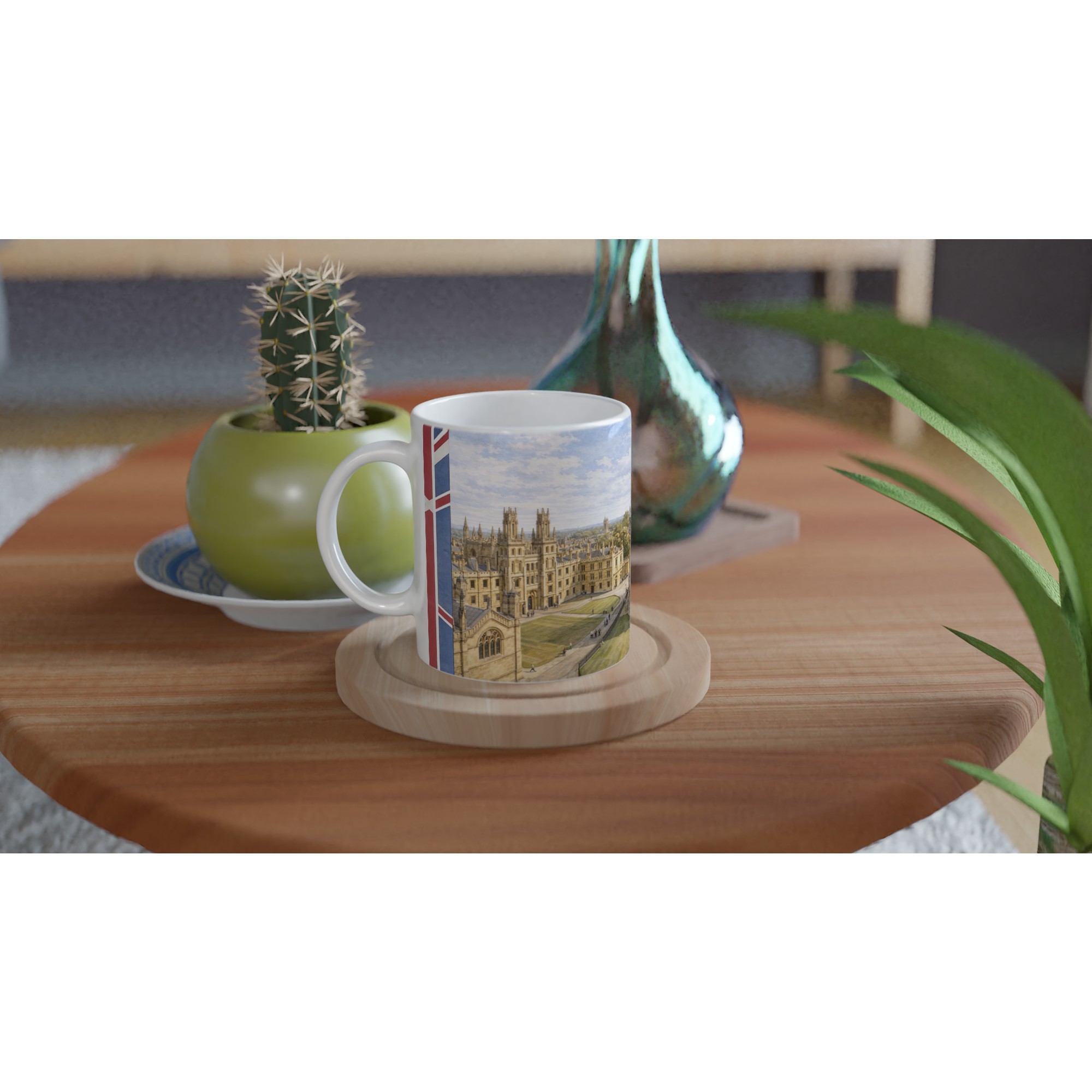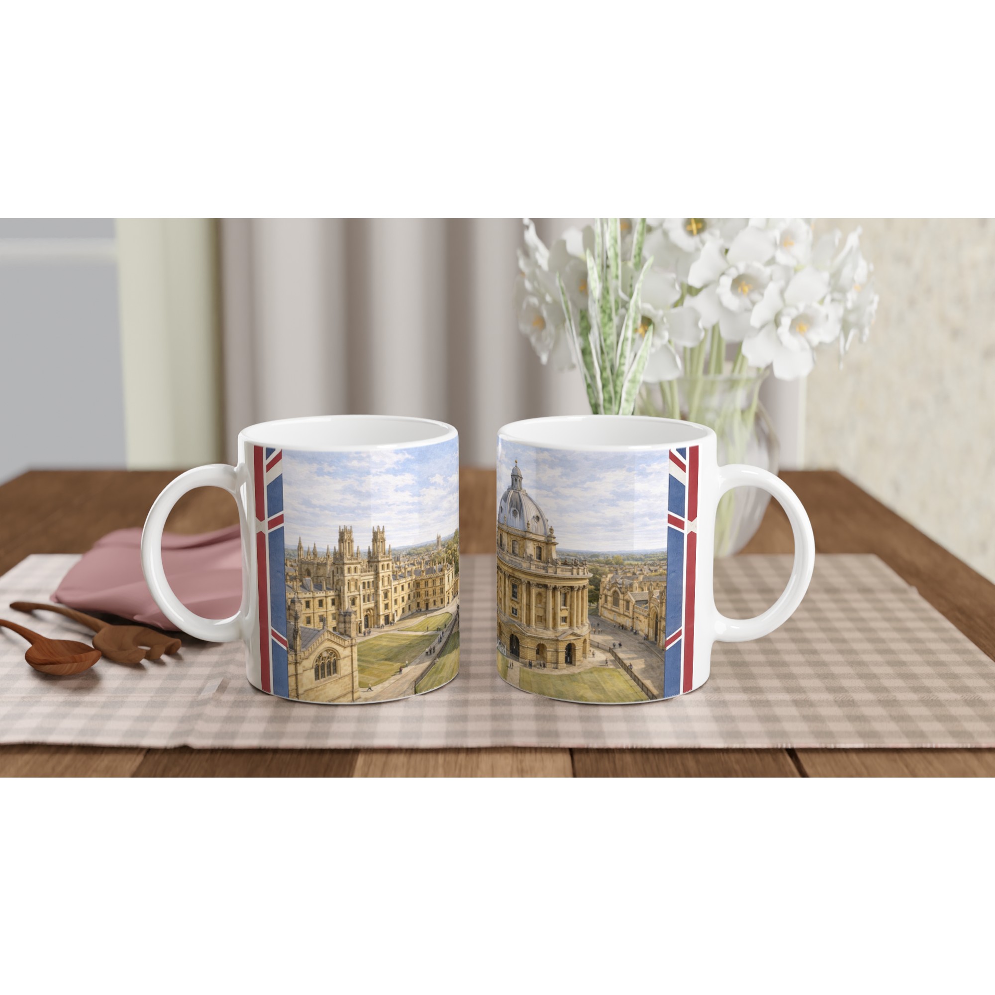 Das Motiv ist rundum sauber auf die Tasse abgestimmt und harmonisch in die Form integriert. Beim Drehen der Tasse entfalten sich Radcliffe Camera, Colleges, Wege und Grünflächen als zusammenhängende kleine Panoramaerzählung.