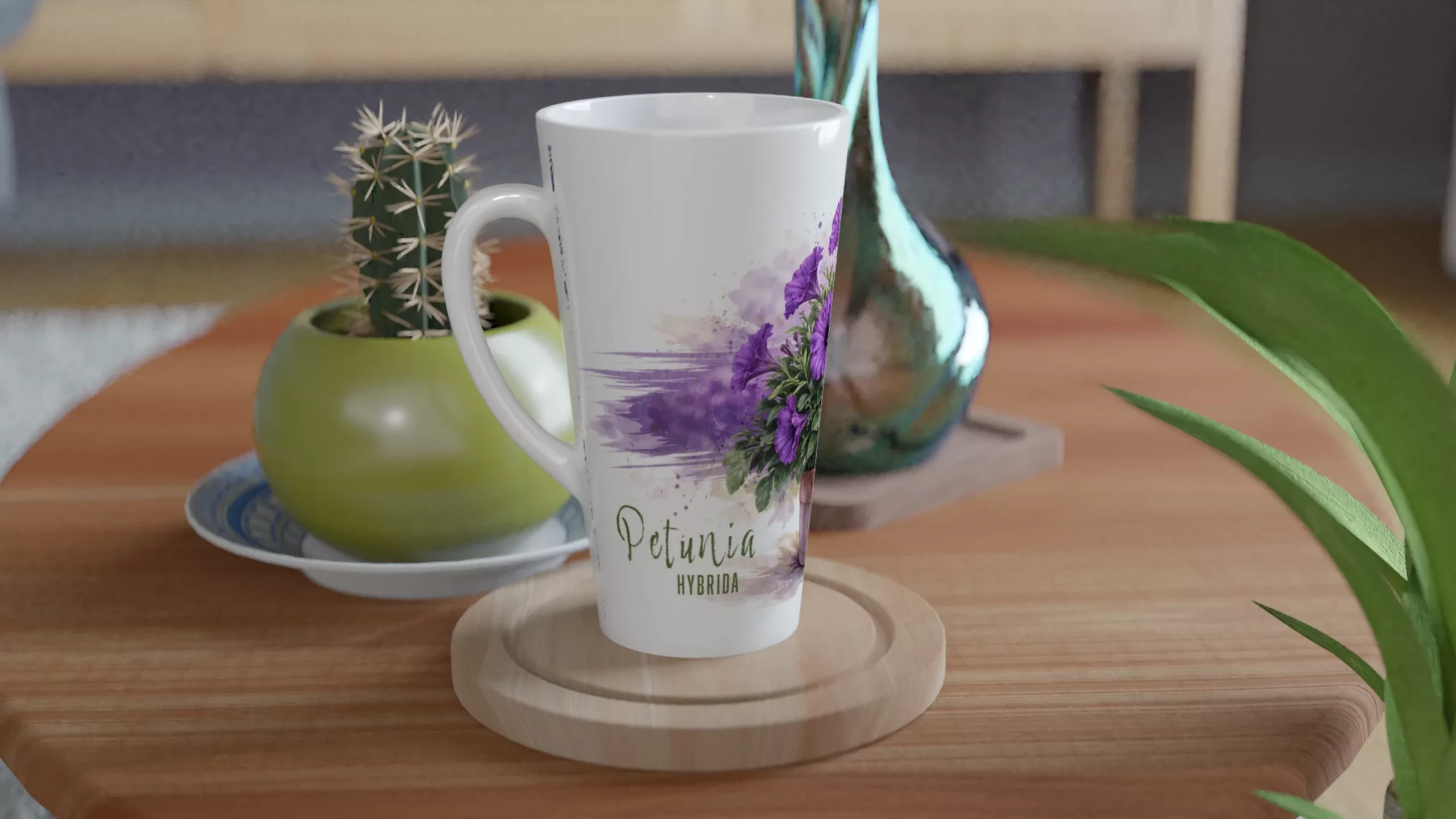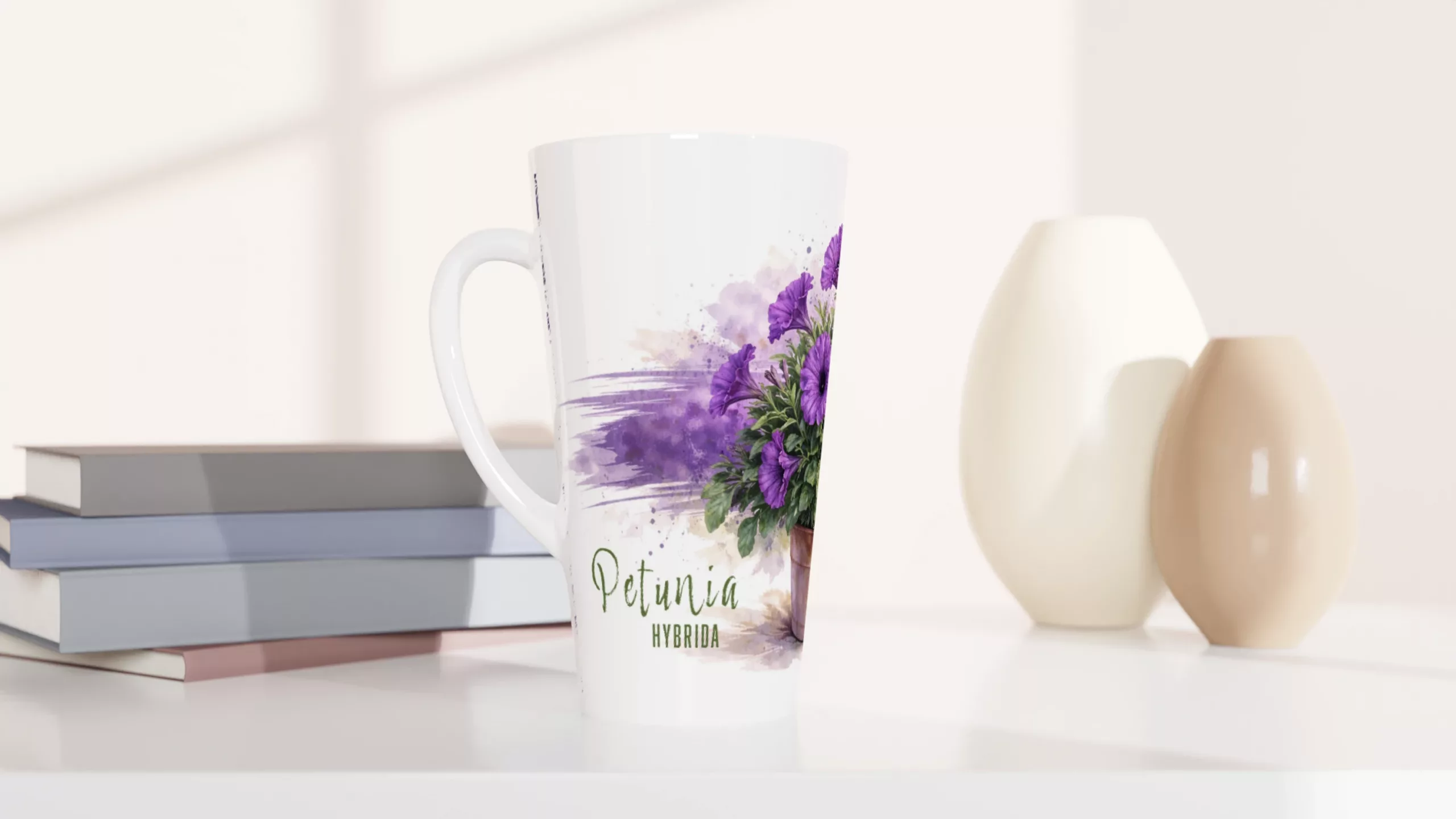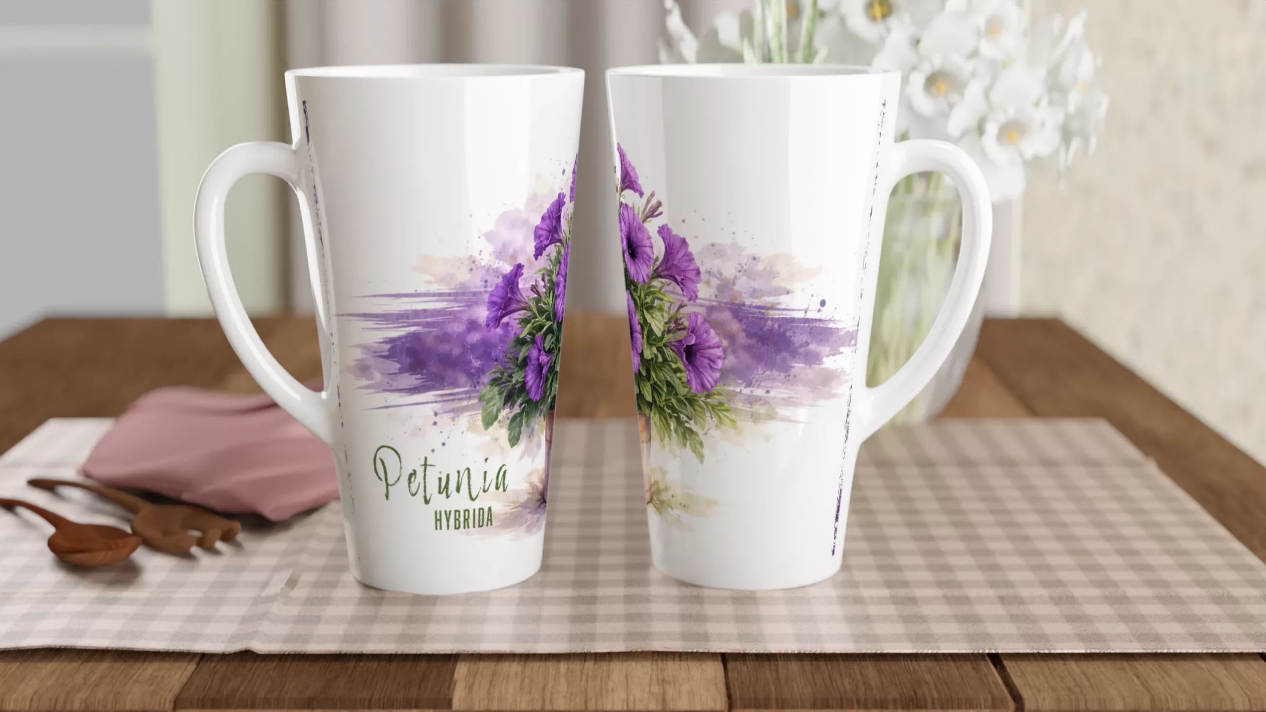 Auf der hohen Latte-Form entfaltet sich dieses Motiv besonders schön. Die vertikale Fläche gibt dem Blütenaufbau genügend Raum, sodass Blätter, Blüten und Topf in einem ausgewogenen Verhältnis wirken. Dadurch bleibt die Komposition klar und präsent. Die Petunie steht nicht gedrängt im Format, sondern erhält genau jene leichte Höhe, die ihr auf der Latte-Tasse besonders gut steht.